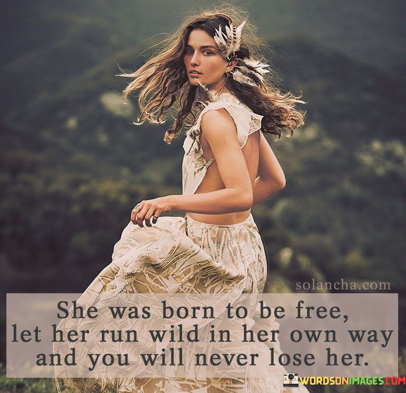 "Let Her Run Wild In Her Own Way, And You Will Never Lose Her" emphasizes the importance of giving her the space and support to be herself fully. By allowing her to be authentic and follow her passions, she will remain connected and devoted to the relationship. Trying to control or stifle her spirit might lead to losing the essence of who she is.