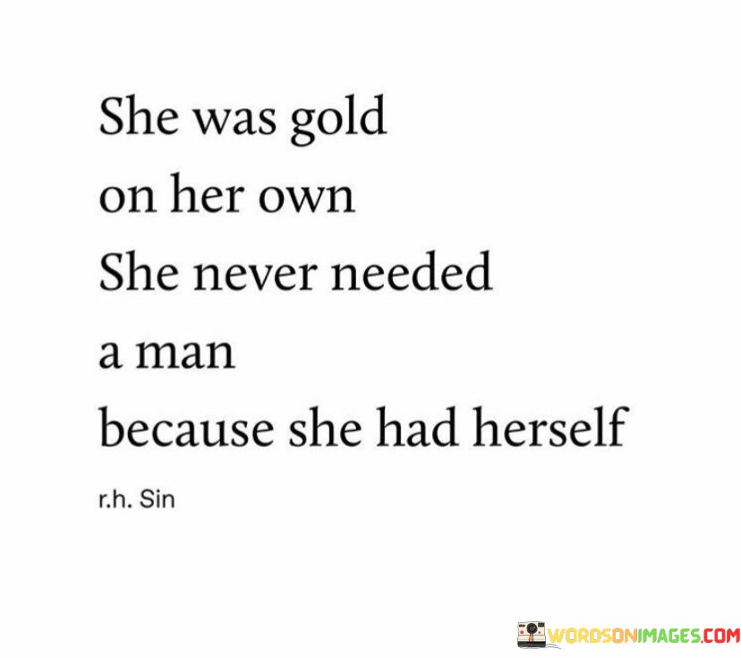 "She was gold on her own" symbolizes her intrinsic worth and the richness of her character. It suggests that she possesses qualities, talents, and self-assurance that make her valuable and exceptional, even without a romantic partner.