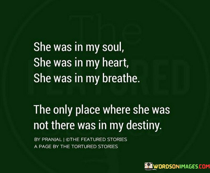 The quote concludes with "The Only Place Where She Was Not There Was In My Destiny," indicating that despite the strong bond they shared, their future together didn't align or materialize. This person, who was so profoundly entwined in their present, didn't play a significant role in their future plans or life path. It speaks to the bittersweet nature of some relationships, where intense love doesn't necessarily translate into a shared future.