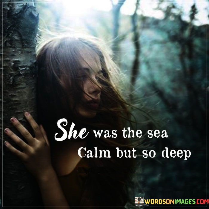 This evocative quote uses the metaphor of the sea to describe a woman's character and emotions. The phrase "she was the sea" suggests that she embodies the vastness and complexity of the ocean, which is often associated with depth, mystery, and power. The subsequent part, "calm but so deep," highlights the apparent serenity and composure she exhibits on the surface, concealing the profound emotional depths within her. Like the calm surface of the sea, she might appear composed and collected, projecting an aura of tranquility to the outside world. However, beneath this calm facade lies a wealth of emotions, experiences, and intricacies that remain hidden from casual observers. The quote celebrates the enigmatic and multifaceted nature of this woman, suggesting that there is much more to her than meets the eye, making her a captivating and intriguing individual.In essence, this quote paints a vivid picture of a woman with a complex and profound inner world. It likens her to the vastness of the sea, conveying the depth and intensity of her emotions and personality. The phrase "she was the sea calm but so deep" highlights the duality of her nature. On the surface, she may project an air of tranquility, radiating a sense of calmness and composure that draws others in. However, beneath this serene exterior lies a depth of emotions and experiences that remain concealed from casual observers. This quote speaks to the mystery and allure that she carries, captivating those who seek to unravel the complexities within her. It reminds us that people are often more intricate and multifaceted than they might appear, urging us to approach others with curiosity and an open heart, ready to discover the hidden depths that lie beneath the surface.