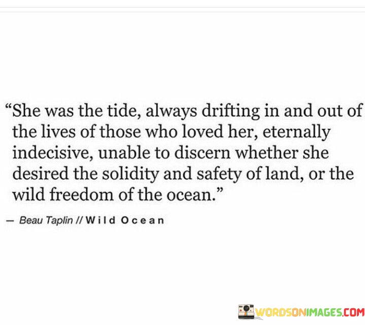 his eloquent quote portrays a woman with a captivating and enigmatic nature. The phrase "She was the tide always drifting in and out of the lives of those who loved her" suggests that she has a dynamic and unpredictable presence in the lives of others. Like the ebb and flow of the tide, she comes and goes, leaving an impact on those who care for her.