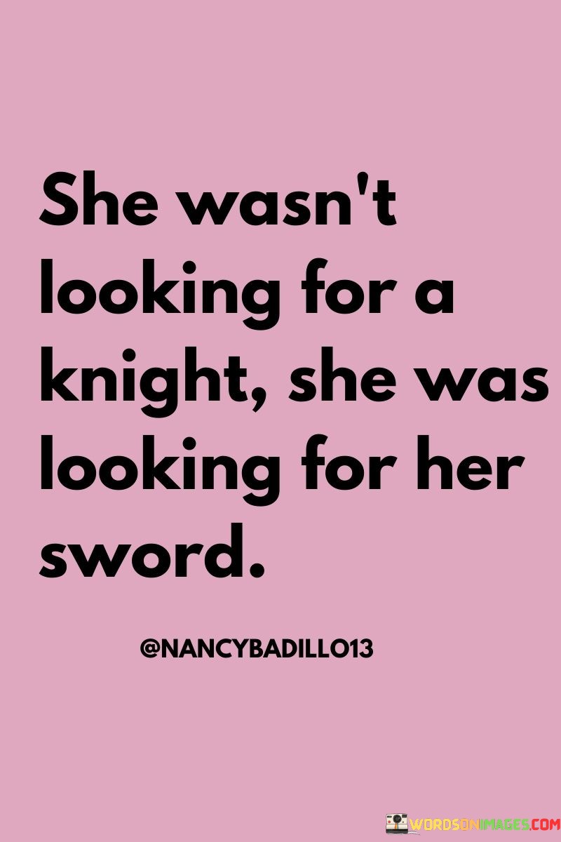 "She wasn't looking for a knight" signifies that the woman is not seeking a traditional romantic partner who might play the role of a knight in shining armor—a symbol of chivalry and protection.