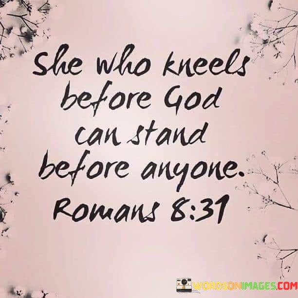 This quote emphasizes the strength and resilience that can be derived from a deep connection with a higher power, often symbolized as "God." It suggests that a person who humbly seeks guidance and support through prayer and devotion can find the inner fortitude to face any challenge or adversity.