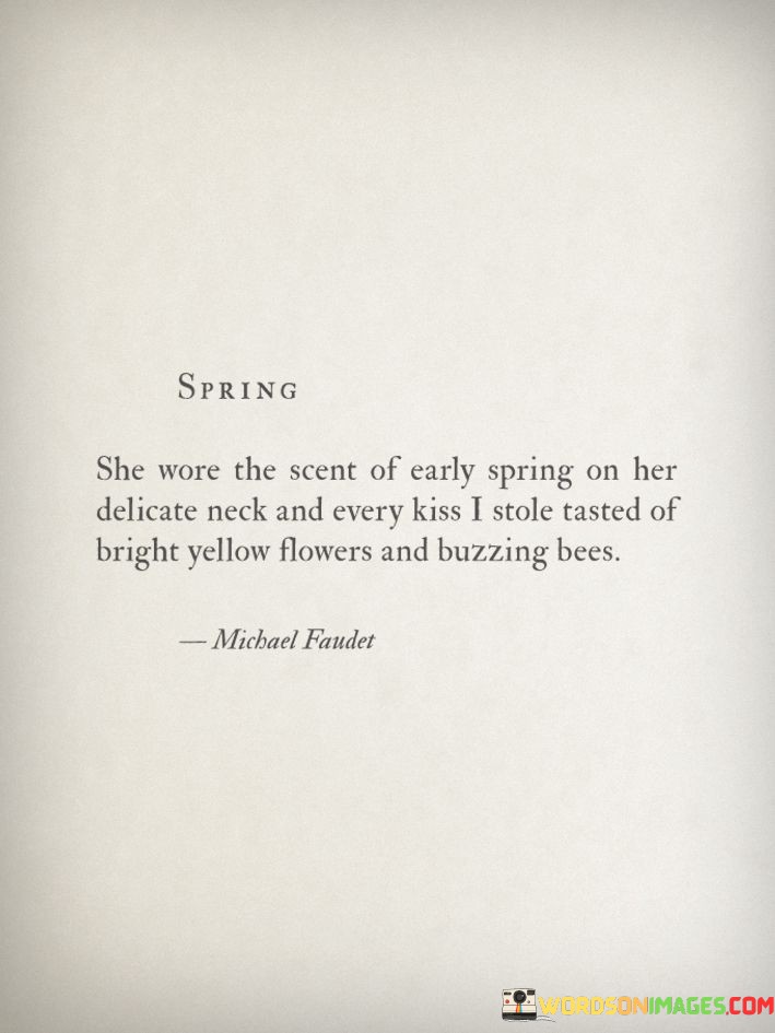 This vivid and poetic quote paints a captivating picture of a woman who exudes the essence of early spring, captivating the senses of the person admiring her. The phrase "She Wore The Scent Of Early Spring On Her Delicate Neck, and Every Kiss I Stole Tasted of Bright Yellow Flowers and Buzzing Bees" beautifully conveys the image of a woman whose presence is reminiscent of the fresh, invigorating fragrance of springtime. The mention of "early spring" suggests a sense of renewal and new beginnings, symbolizing the woman's captivating allure and the potential for blossoming love. The description of "bright yellow flowers and buzzing bees" in the stolen kisses evokes a sense of nature's beauty and vitality, infusing the romantic encounters with a delightful sensory experience. The imagery used in this quote not only captures the physicality of the woman but also evokes a deeper connection to the natural world, portraying her as a vibrant and alluring force of life and beauty. In a broader context, this quote celebrates the magic and wonder of romance, portraying the woman as a mesmerizing and captivating figure. Her delicate neck, scented with the essence of spring, becomes a sensory trigger for the person experiencing her presence. The mention of stolen kisses suggests an intimate and passionate connection, where the person is entranced by the woman's aura and finds solace and delight in the natural imagery evoked by their encounters. This quote also highlights the powerful connection between human emotions and the beauty of nature, as the woman's presence evokes the sensations and images of springtime, representing a season of growth, new life, and vitality. Ultimately, this quote captures the essence of a woman who embodies the beauty of nature and love, weaving together the imagery of springtime with the tender moments shared with her admirer, creating a romantic and enchanting tableau of blossoming affection and emotional connection.