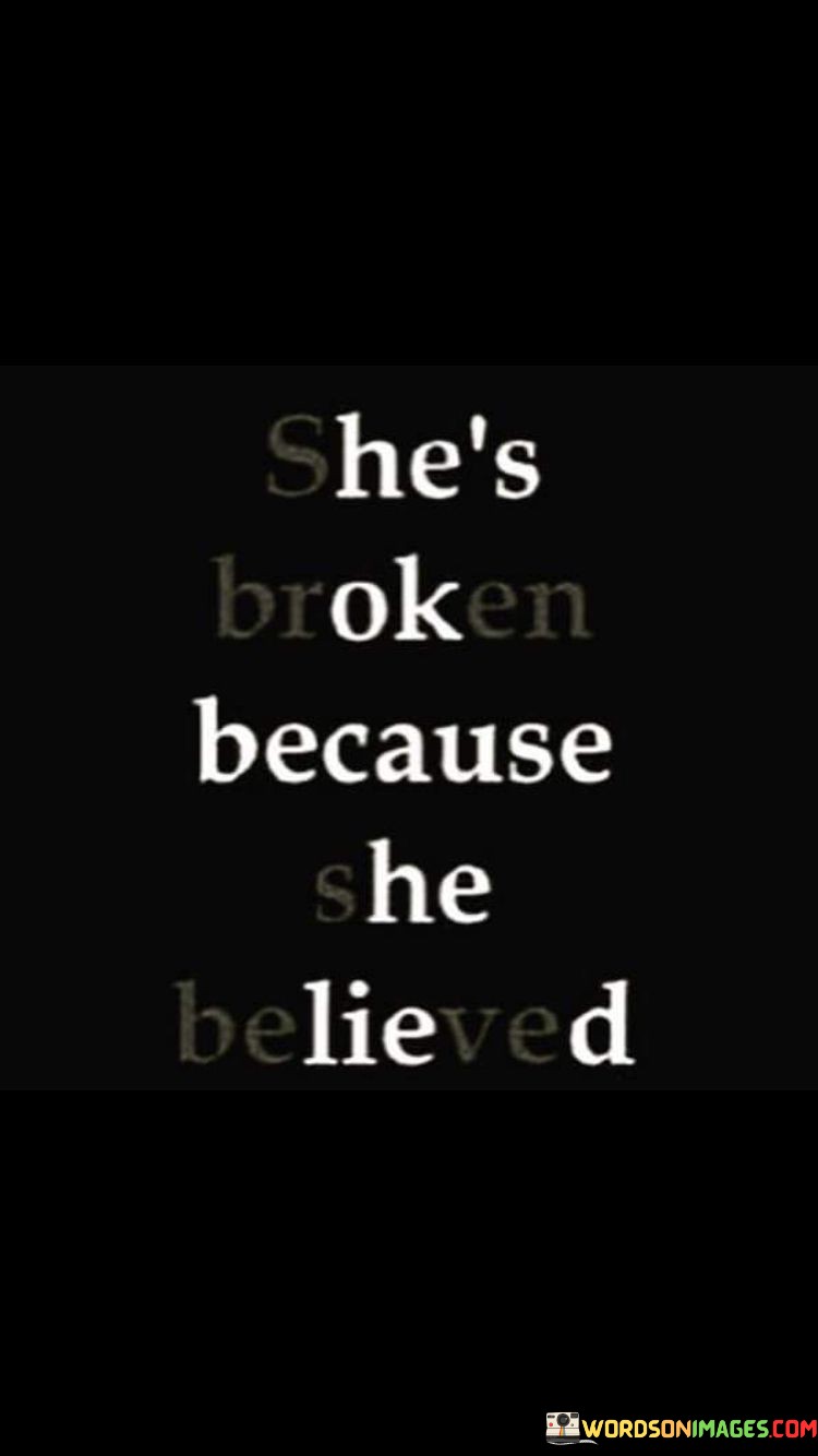 This poignant quote delves into the emotional vulnerability and resilience of a woman who has faced disappointment and pain in her life due to her capacity to believe in others. The phrase "She's broken because she believed" encapsulates the experience of a woman who has been let down, betrayed, or hurt by others despite her genuine trust and faith in them. It speaks to the profound impact that shattered trust and unmet expectations can have on a person's emotional well-being, leaving them feeling broken and vulnerable. This quote sheds light on the paradoxical nature of belief, where the act of trusting and investing emotionally in others can lead to both profound connections and deep wounds.