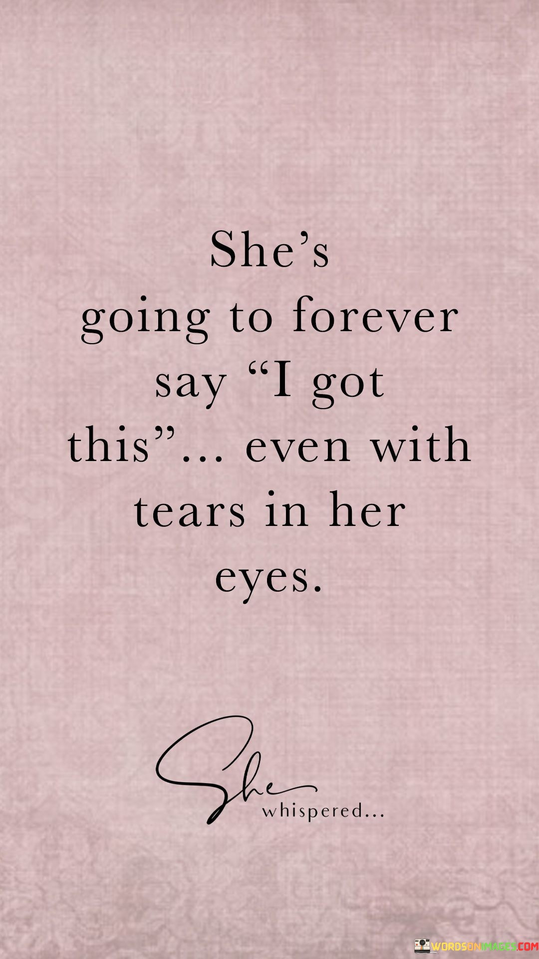 The quote "She's going to forever say 'I got this' even with tears in her eyes" beautifully encapsulates the essence of unwavering strength, resilience, and determination in the face of adversity. The phrase portrays a woman who possesses an unyielding spirit, always ready to take on challenges with a sense of self-assuredness. The repetition of "I got this" indicates her consistent and resolute attitude, emphasizing her refusal to be defeated or overwhelmed by difficult circumstances. Even when tears well up in her eyes, a symbol of vulnerability and emotion, she maintains her composure and continues to affirm her capability to handle whatever comes her way.The quote celebrates the power of a positive mindset and the ability to persevere through life's struggles with courage and grace. It conveys that she confronts her emotions head-on but doesn't let them deter her from facing challenges with strength and determination. The phrase suggests that her determination is not simply a facade but a genuine belief in her own abilities to navigate through adversity. Her resilience shines through as she pushes forward despite the tears, refusing to be defined by her emotions or overwhelmed by them. In a world that often demands unyielding strength, she serves as an inspiration, demonstrating that acknowledging vulnerability and embracing emotions doesn't make one weak but rather showcases the immense strength in persevering with a positive attitude. This quote serves as a reminder that it's okay to feel emotions and yet retain the confidence to tackle life's difficulties head-on, standing tall and proclaiming, "I got this."