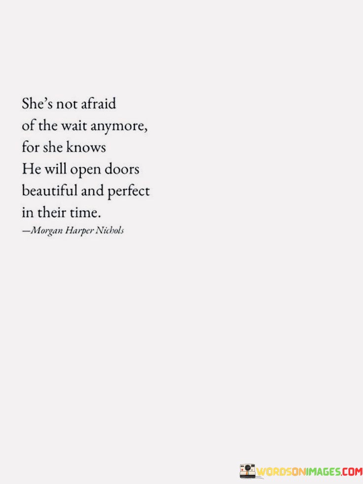 This quote speaks to the transformation of a person's mindset and perspective when it comes to waiting and trusting in the timing of life's events. Initially, the subject may have experienced fear or impatience while waiting for certain opportunities or experiences. However, as time passes, she undergoes a significant change in her attitude towards waiting. This change is marked by newfound confidence and faith in the future. She becomes certain that the person or force she believes in, represented as "he" in the quote, will open doors for her. These doors are described as "beautiful and perfect," emphasizing the positive and fulfilling nature of the opportunities that await her. The subject's unwavering belief in the divine timing of events enables her to surrender to the process of waiting, understanding that everything will unfold as it should, at the right moment. This quote encourages embracing patience, trusting in the universe, and recognizing that the best outcomes will manifest when the time is right. It serves as a reminder to let go of anxieties surrounding waiting and instead find solace in the knowledge that life's doors will open in their own exquisite and precise time.
