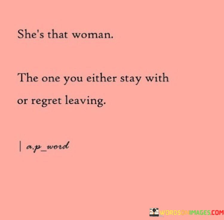 The quote "She's that woman, the one you either stay with or regret leaving" encapsulates the essence of a person who leaves a lasting impact on those who cross her path. It underscores the profound nature of the relationship dynamics surrounding her.
