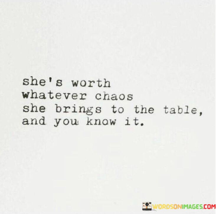 This quote carries a powerful message about the value of a person's presence in one's life, acknowledging that despite any challenges or complexities they may bring, their worth is immeasurable. The phrase "she's worth whatever chaos she brings to the table" suggests that this individual, likely a woman, may come with intricacies and occasional disruptions, yet her significance and impact on the other person's life are undeniable. It implies that the depth of connection, love, and admiration they have for her surpasses any hardships or difficulties that may arise in the relationship. The phrase "and you know it" reinforces the certainty and awareness of this fact.In essence, the quote celebrates the authenticity and realness of this person, recognizing that genuine relationships are not always perfect or free of challenges. It acknowledges that everyone has their unique qualities and complexities, and what matters most is the love and appreciation shared between them. It speaks to the idea that true connections are based on understanding, acceptance, and embracing the entirety of a person, even if it means navigating occasional chaos or unpredictability.