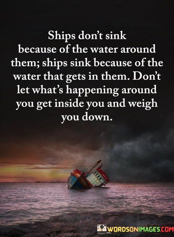 The analogy "Ships don't sink because of the water around them; ships sink because of the water that gets in them" serves as a powerful reminder to not let external circumstances or negative influences infiltrate our inner being and drag us down. In this analogy, ships are used as a symbol of resilience and strength. Despite being surrounded by vast bodies of water, ships remain afloat and continue their journey as long as water does not penetrate their hulls. The hulls act as a protective barrier, keeping the water out and ensuring the ship's stability. Likewise, we encounter various challenges, difficulties, and negativity in our lives—the "water" that surrounds us. However, just as ships sink when water infiltrates their interior, we can be weighed down and succumb to despair if we allow external circumstances to permeate our inner selves. The phrase advises us to safeguard our inner resilience and mental well-being, similar to how a ship protects its hull. We cannot always control the events and situations around us, but we have agency over how we respond to them. To stay afloat and navigate through life's challenges successfully, it is essential not to let external circumstances define our internal state. Rather than allowing negativity, stress, or external pressures to seep into our thoughts and emotions, we can choose to maintain a sense of inner peace and strength. Practicing mindfulness and emotional resilience can help us maintain a protective barrier against the negative influences that surround us. By staying grounded in our values, beliefs, and self-awareness, we can preserve our mental and emotional well-being, even in turbulent times.