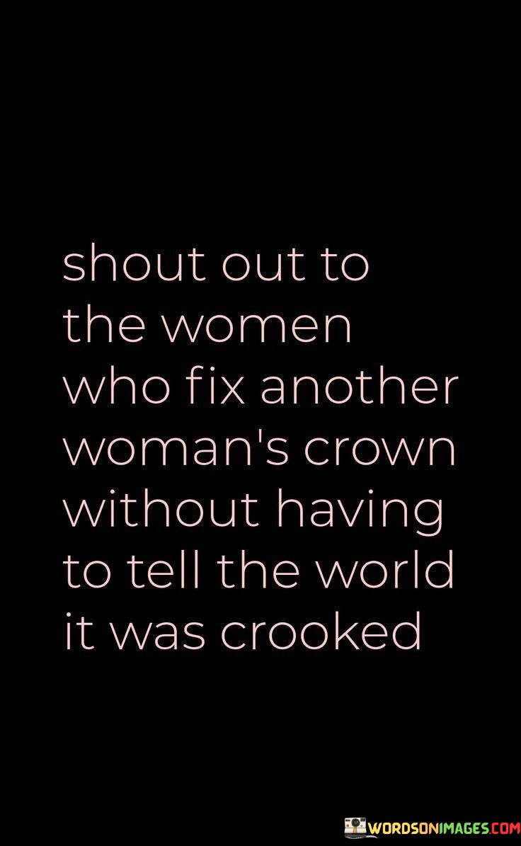 This beautiful quote pays tribute to the unsung heroes among women who quietly support and uplift their fellow sisters. It praises those who possess the genuine and compassionate spirit to help without seeking recognition or validation from others. The metaphor of "fixing another woman's crown" symbolizes the act of assisting someone in regaining their confidence, self-esteem, or strength, much like straightening a tiara or crown that has become askew. However, what sets these remarkable women apart is their humility and sincerity. They do not boast or publicize their acts of kindness, and they do not draw attention to the fact that they have helped another woman in need. Instead, their actions stem from a place of empathy and understanding, driven by the desire to support and uplift their fellow women without any expectations in return. This quote serves as a powerful reminder of the incredible impact that simple acts of kindness and support can have on each other's lives. It encourages us to be more mindful of extending genuine help to others, not for recognition, but to create a community where women can strengthen and empower each other in a selfless and unassuming manner. In a world often obsessed with visibility and self-promotion, this quote celebrates the quiet heroines who, with a single gesture, make the world a kinder and more compassionate place for all women.