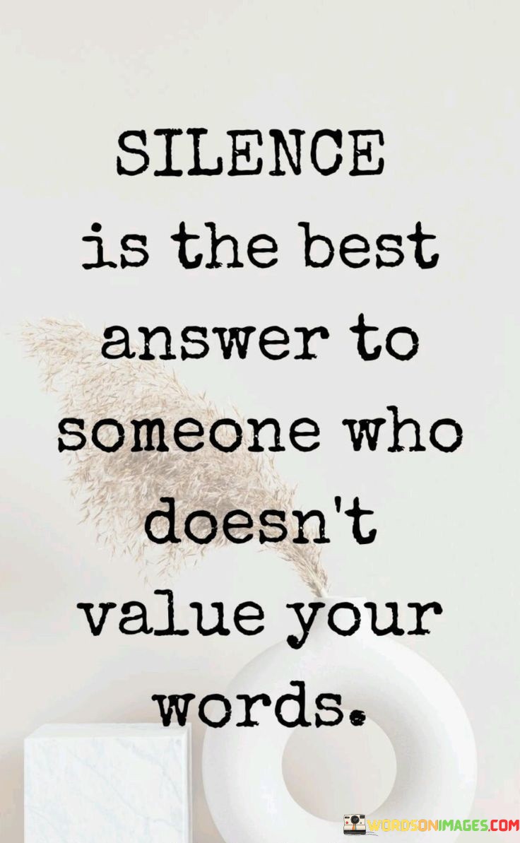 The quote "Silence is the best answer to someone who doesn't value your words" suggests that withholding a response can be a powerful choice when interacting with individuals who disregard or belittle your thoughts. It implies that giving attention to those who don't appreciate your words may be futile.