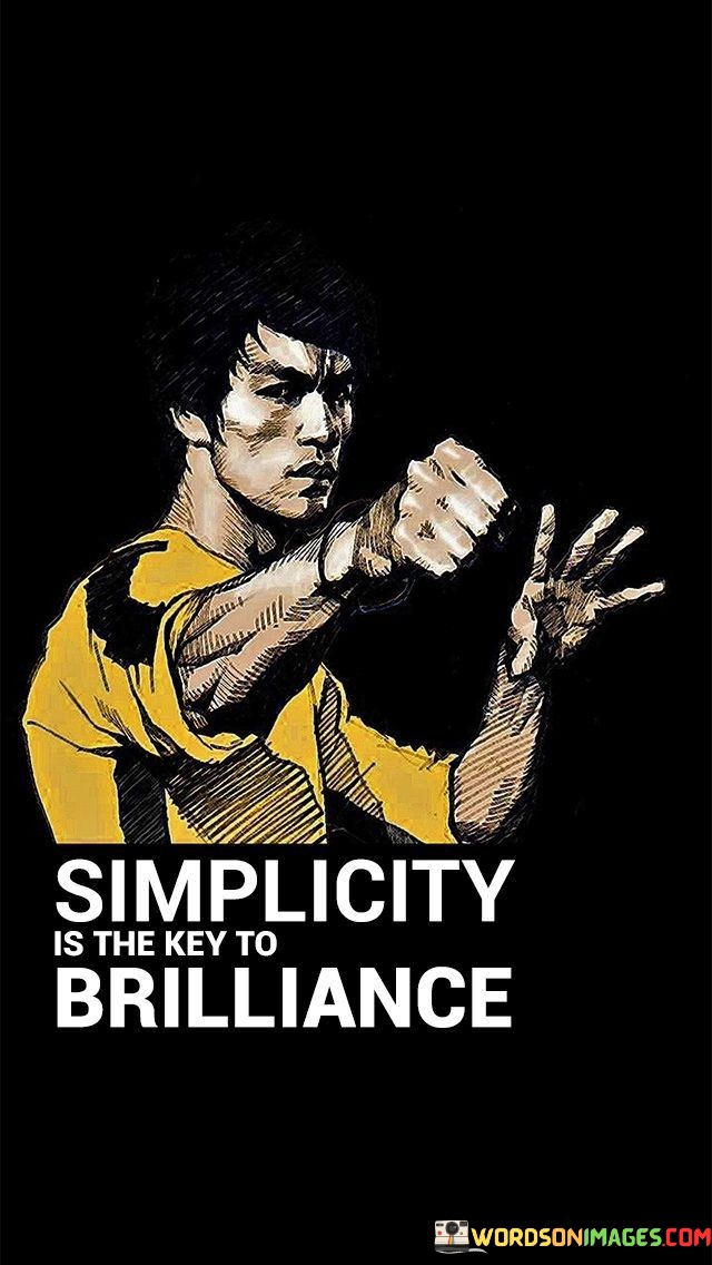 The quote "Simplicity is the key to brilliance" encapsulates the profound idea that greatness and excellence can often be achieved through simplicity and clarity. It emphasizes that complex and convoluted solutions are not necessarily superior; rather, it is the elegance and straightforwardness of simple approaches that can lead to brilliance. In various fields, from design and technology to art and philosophy, simplicity has been hailed as a powerful guiding principle. In design, for example, minimalist aesthetics are often praised for their ability to convey powerful messages and evoke emotions with just a few elements. In technology, simple and user-friendly interfaces are favored for their accessibility and ease of use. In problem-solving and decision-making, simplicity can cut through the noise and distractions, enabling a clear focus on the most essential aspects. It allows for streamlined processes and efficient solutions. Complexity may lead to confusion, while simplicity can lead to clarity and understanding. Moreover, simplicity is often associated with elegance and sophistication. It is the art of removing unnecessary complexities and presenting ideas or creations in their most refined form. In art and literature, simplicity in expression can evoke powerful emotions and leave a lasting impact on the audience. The quote also emphasizes the importance of avoiding overcomplication and overthinking. Often, the most brilliant ideas and solutions are found in simplicity and straightforwardness. By not getting entangled in unnecessary complexities, individuals can access the core essence of a problem or concept and unleash the brilliance within it. However, achieving simplicity is not always easy; it requires a deep understanding of the subject matter and the ability to distill the most critical elements. It involves refinement and precision to retain only what is essential while discarding what is extraneous. In conclusion, the quote "Simplicity is the key to brilliance" celebrates the power of simplicity as a guiding principle in various aspects of life. It underscores that greatness and brilliance can be achieved through clarity, elegance, and straightforwardness. Simplicity allows for focus, efficiency, and powerful communication. It encourages individuals to embrace simplicity in problem-solving, creativity, and decision-making, avoiding unnecessary complexities and finding brilliance in the most refined and essential elements. Ultimately, simplicity is not a compromise but a gateway to brilliance and excellence.