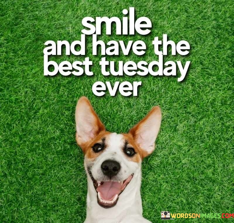 The quote "Smile and Have the Best Tuesday Ever" encapsulates a cheerful and motivating sentiment. It encourages embracing the new day with a positive attitude and a genuine smile. By choosing to smile, you set the tone for your Tuesday, fostering a mindset of optimism and enthusiasm.