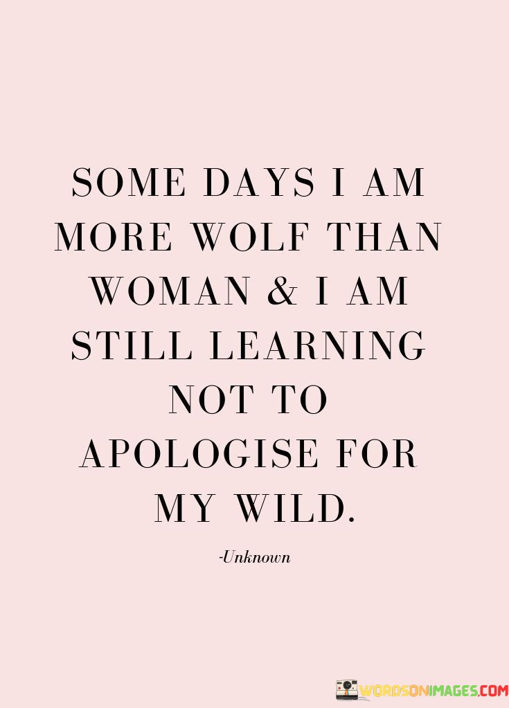 This evocative quote delves into the complexities of a person's identity, particularly a woman's, and celebrates the untamed and powerful aspects of her nature. The phrase "Some days I am more wolf than woman" evokes the idea that the speaker sometimes feels connected to the fierce and instinctual qualities often associated with wolves. This may refer to moments when she feels strong, assertive, and unapologetically in touch with her primal instincts. The quote emphasizes that these qualities are not something to be ashamed of or to apologize for. Instead, it expresses a journey of self-discovery and acceptance, as the speaker acknowledges her wild side and learns to embrace it fully without feeling the need to conform to societal expectations or norms.The mention of "still learning not to apologize for my wild" speaks to the societal pressure often placed on women to be gentle, nurturing, and conforming. The speaker recognizes that her wild nature may be viewed as unconventional or intimidating by others, but she is actively challenging the notion that she should apologize for being true to herself. This quote is an empowering declaration of self-acceptance and self-love, encouraging individuals, especially women, to embrace all aspects of their personalities, including the untamed and passionate parts.It celebrates the strength and beauty found in authenticity, encouraging people to shed the need to seek approval from others and to unapologetically live their lives in harmony with their true selves. The imagery of the wolf further emphasizes the primal, powerful, and free-spirited nature that lies within all individuals. In a world that often demands conformity and stifles uniqueness, this quote serves as a reminder that one's wild and untamed essence is a source of strength and authenticity, deserving of acceptance and celebration. It calls for embracing the wild within and recognizing it as a vital part of the human experience.