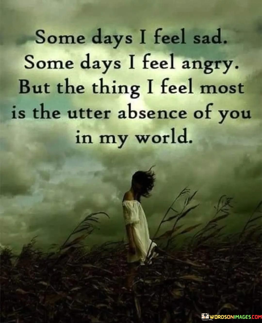 The quote reflects the range of emotions tied to a significant absence. "Feel sad" and "feel angry" signify varying emotional states. "Utter absence of you" underscores the profound void left behind. The quote conveys the overpowering impact of someone's absence in the speaker's life.