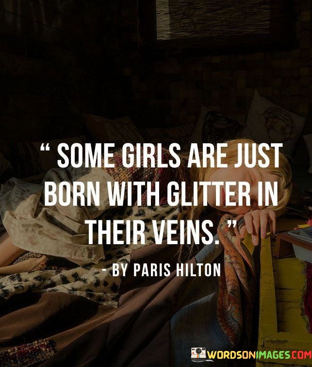This quote celebrates the innate charm, radiance, and uniqueness of certain girls who possess an extraordinary and captivating essence. It playfully suggests that these girls seem to have a special spark within them, symbolized by "glitter in their veins." This metaphorical glitter represents their magnetic and effervescent personalities, which draw others in and leave a lasting impression. These girls exude confidence, positivity, and an aura of enchantment that sets them apart from the crowd. It implies that their charm is not something acquired or learned but is an inherent part of their being, making them stand out effortlessly and leaving a trail of fascination wherever they go. The quote evokes a sense of admiration and wonder, acknowledging that some individuals possess a natural allure that captivates and uplifts those around them. It recognizes the magical quality that sets these girls apart and makes them shine in any setting. It also serves as a reminder of the beauty of individuality and the diverse qualities that make each person unique and extraordinary in their own way. By associating these girls with "glitter in their veins," the quote embraces the idea that every person has their own special charm and radiance, celebrating the individuality and sparkle that reside within us all. In essence, this quote celebrates the inherent beauty and magnetism found in some girls, acknowledging their captivating presence and inspiring us to appreciate and embrace the enchanting qualities that make each person one-of-a-kind.