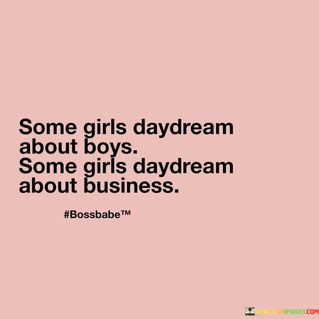 This quote highlights the diversity of dreams and aspirations that individuals, specifically girls, may have. It draws attention to the fact that not all girls have the same interests or desires, and that is perfectly normal and valid. The phrase "Some girls daydream about boys" refers to traditional and common notions of romantic daydreams or fantasies that some girls may have, focusing on love, relationships, and romance. On the other hand, the phrase "Some girls daydream about business" showcases a different set of aspirations, where girls envision themselves succeeding in the business world, pursuing entrepreneurial endeavors, and achieving professional success.The quote challenges stereotypes and gender norms by emphasizing that girls are multifaceted individuals with a wide range of dreams and ambitions. It encourages the recognition and acceptance of diverse interests and goals, promoting the idea that there is no right or wrong way for girls to dream or envision their futures. By acknowledging both the romantic and the career-driven daydreams, the quote promotes inclusivity and empowers girls to embrace their passions and aspirations, whatever they may be.Furthermore, the quote serves as a reminder that society should not limit or pigeonhole individuals based on their gender. It challenges the notion that girls are primarily defined by their relationships or romantic pursuits and highlights their potential as leaders, entrepreneurs, and professionals. Overall, the quote celebrates the richness and complexity of human dreams, showing that girls can daydream about love or business, or anything else that speaks to their hearts and drives them towards a fulfilling and purposeful life. It advocates for a world that respects and nurtures the diverse dreams and ambitions of girls, supporting their journey to turn those daydreams into reality.