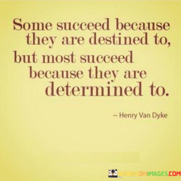 "Some Succeed Because They Are Destined To, But Most Succeed Because They Are Determined To" highlights the interplay between destiny and determination in achieving success. It suggests that while fate might play a role for some, the majority of successful individuals attain their goals through unwavering determination and effort.
