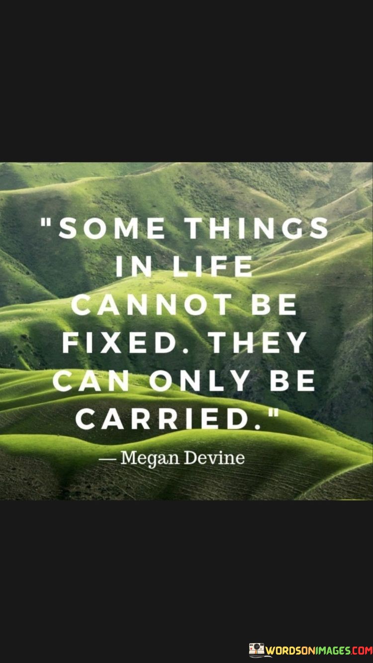 The quote highlights the notion that not everything is fixable. Certain issues remain despite efforts, but we can learn to coexist with them. It emphasizes resilience, teaching us to carry burdens gracefully. Acceptance and carrying forward become pivotal in navigating the aspects of life that resist correction or change.