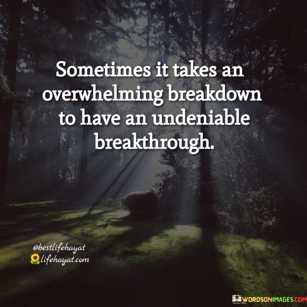 The quote illustrates the paradox of growth through struggle. It suggests that experiencing a complete breakdown can be the catalyst for a transformative breakthrough. The intensity of the breakdown forces change, often leading to a powerful realization that paves the way for significant personal advancement.