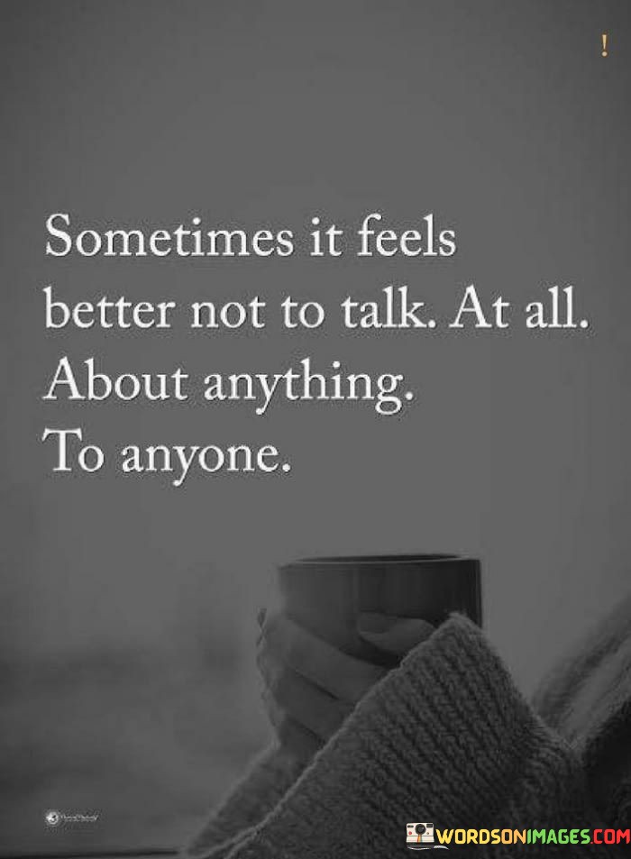 The quote conveys the comfort in silence. "Feels better not to talk" implies a preference for quiet. "About anything to anyone" underscores the discretion. The quote highlights the solace found in keeping thoughts private.