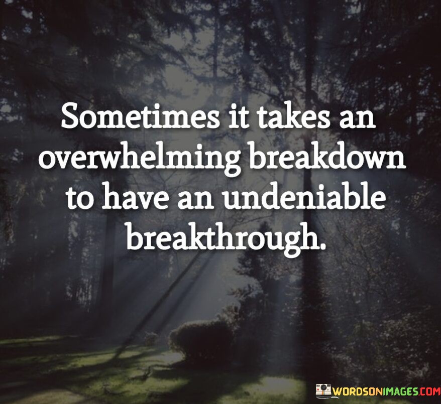 "Sometimes it takes an overwhelming breakdown" emphasizes the intensity of the emotional or psychological turmoil that one might go through. It speaks to moments when we feel utterly overwhelmed by challenges, stress, or emotional pain.