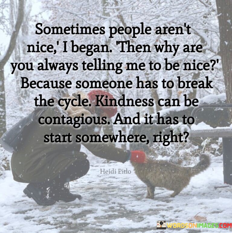 "Because someone has to break the cycle" reminds us of the power of kindness to counteract negativity and inspire positive change. It emphasizes the transformative potential of kind actions in improving the overall atmosphere and promoting understanding.