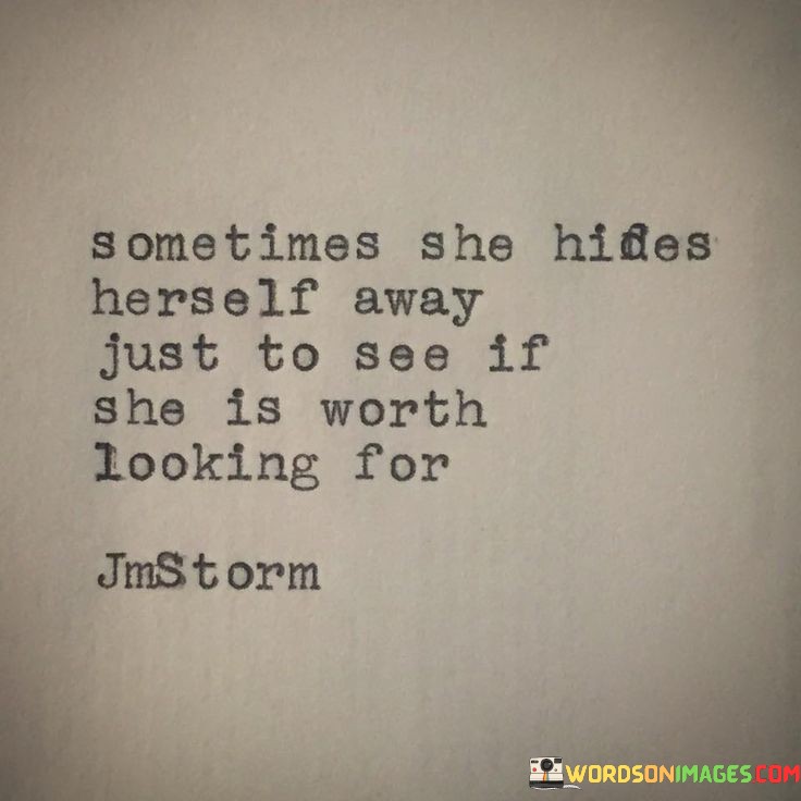 This evocative quote delves into the complex emotions of a person who chooses to retreat or distance themselves from others, not out of a desire to isolate, but rather as a means of self-discovery and validation. The phrase "sometimes she hides herself away" suggests that the individual withdraws from the spotlight or the constant presence of others, seeking solitude and introspection. This act of seclusion is a way for her to introspect, evaluate her self-worth, and understand her significance to those around her. By stepping back and removing herself from the immediate attention of others, she tests whether she is truly valued and cherished. This self-imposed separation becomes a measure of her worthiness, revealing who genuinely cares enough to seek her out. It also reflects her longing to be appreciated for her authentic self, independent of external validation or attention.In essence, this quote captures the complexity of human emotions and the desire for genuine connection. It portrays a poignant journey of self-discovery, where the individual seeks to understand her value and significance in the lives of others. The act of hiding away is not an act of rejection but a means of introspection and a test of the authenticity of relationships. It becomes a subtle call for those who truly care to step forward, showing that they appreciate and cherish her for who she is. This quote serves as a reminder of the importance of genuine connections and the longing for meaningful relationships, where individuals are valued for their true selves. It highlights the significance of taking the time to understand one's worth and the role that others play in our lives, ultimately revealing the depth of emotional connections and the authenticity of the bonds that tie us together.