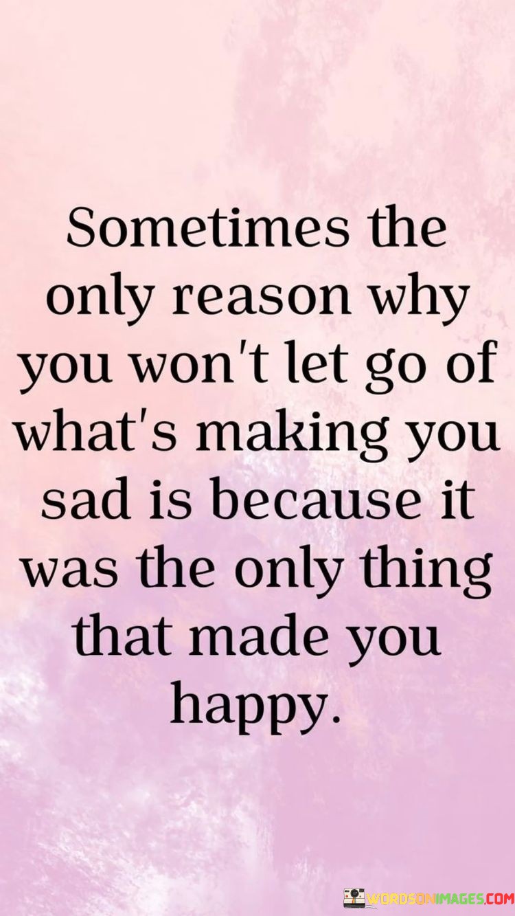The quote delves into the complexities of attachment. "Won't let go" signifies reluctance. "Only thing that made you happy" reflects past joy. The quote conveys the emotional struggle of holding onto something that once brought happiness, even if it now causes sadness.