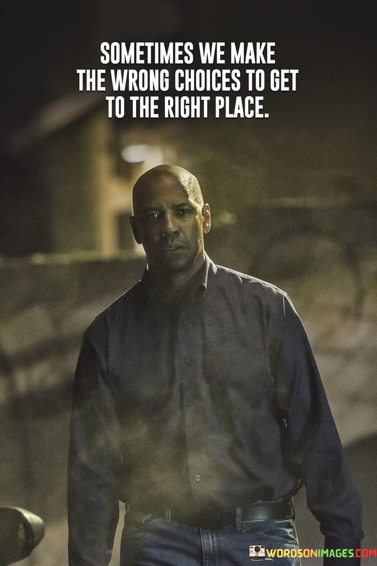 The quote reflects on the concept of making mistakes for eventual personal growth. "Wrong choices" signify errors in judgment. "To get to the right place" implies a destination of self-improvement or a better situation. The quote conveys the idea that sometimes, mistakes are necessary steps toward achieving a greater goal.