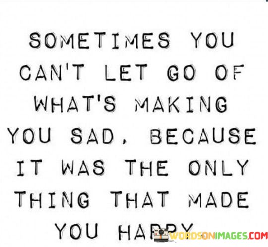 The quote addresses the complexity of holding onto something despite its causing sadness. "Can't let go" signifies emotional attachment. "Only thing that made you happy" implies a deep connection. The quote conveys the dilemma of clinging to what once brought joy, even if it now brings sorrow.