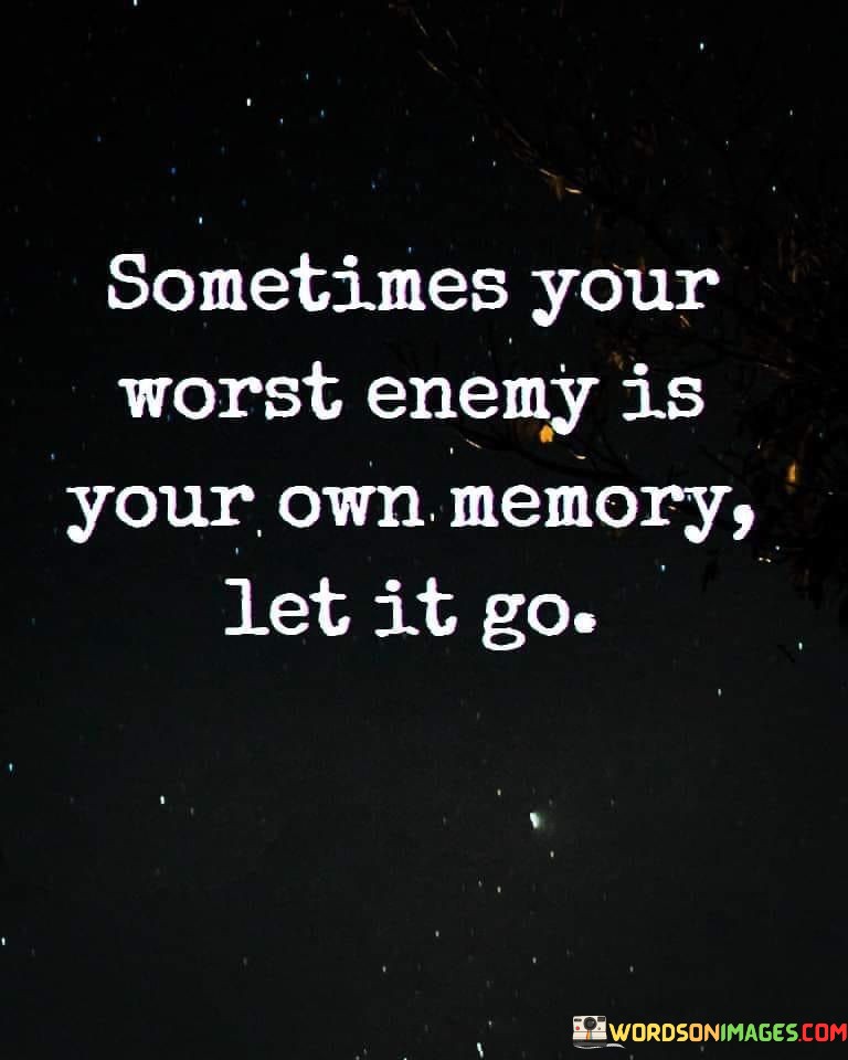 This poignant quote delves into the complexities of our memories and their potential to become our own worst adversaries. It suggests that certain memories can haunt us, causing pain, regret, or anxiety. The advice to "let it go" urges us to release the grip of these negative memories and break free from their influence on our present and future.Our memories hold a significant impact on our lives, shaping our perceptions and influencing our emotions. While some memories can be cherished and bring joy, others can evoke painful experiences or regrets from the past. Holding onto these negative memories can create a cycle of suffering, preventing us from fully embracing the present and hindering personal growth.In essence, this quote reminds us that we have the agency to shape our relationship with our memories. By learning to let go of the burdensome ones, we create space for growth, resilience, and a more liberated and joyful existence. Embracing this practice allows us to focus on the present and embrace the possibilities of the future without being weighed down by the past.