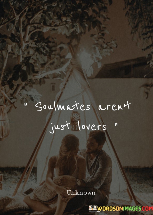 The quote "Soulmates Aren't Just Lovers" reminds us that deep connections go beyond romantic relationships. A soulmate is someone who profoundly understands and connects with your inner self, offering companionship and support in various forms. While lovers can be soulmates, the quote emphasizes that soulmates encompass a wider spectrum of relationships.
