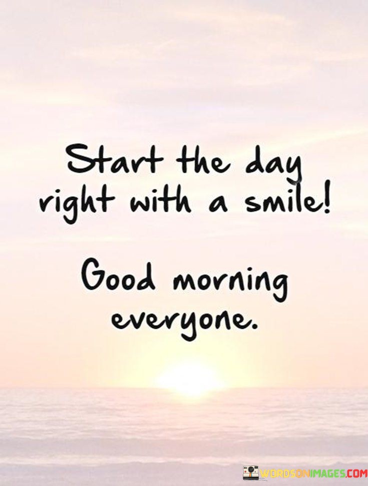 "Start the day right with a smile. Good morning, everyone." This quote encourages beginning the day on a positive note by greeting it with a smile.