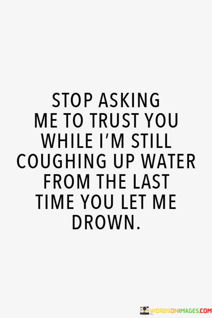 By using the metaphor of "coughing up water from the last time you let me drown," the quote vividly illustrates the emotional trauma and vulnerability experienced after being let down. It serves as a powerful reminder of the consequences of broken trust and the need for genuine efforts to regain trust in any relationship. The quote urges others to be patient, empathetic, and understanding in the process of rebuilding trust.