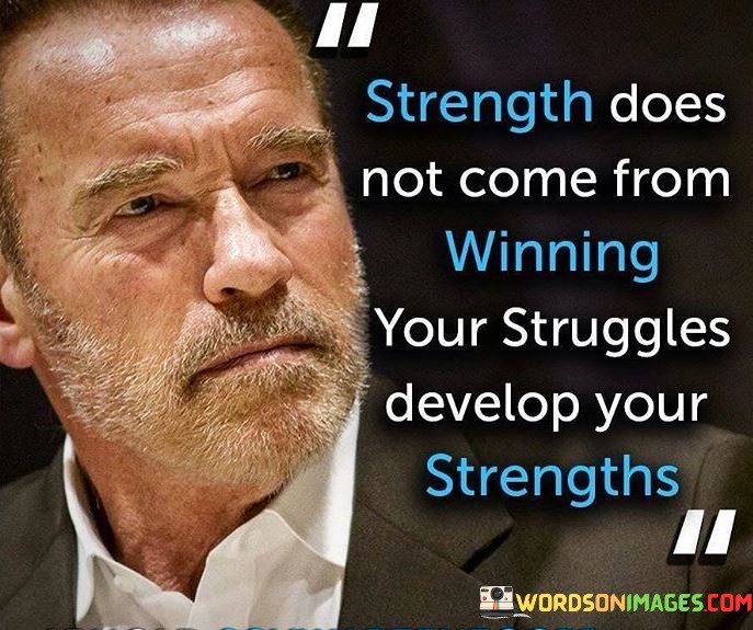 The quote underscores that personal growth is intertwined with struggle. While victories may boost confidence, it's the struggle to overcome adversity that fosters true strength. Challenges force us to tap into hidden potential, pushing our boundaries. Such hardships build character, instill determination, and cultivate the inner fortitude that lasts far beyond any single triumph, making us truly strong.
