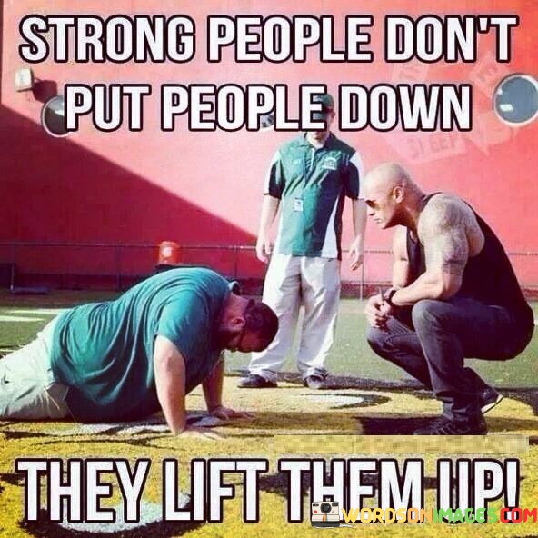 The quote champions compassion and empowerment as marks of strength. It asserts that instead of belittling others, strong individuals uplift and encourage. True strength lies in nurturing positive growth, fostering an environment where people flourish and develop their potential, underlining the power of kindness and support.