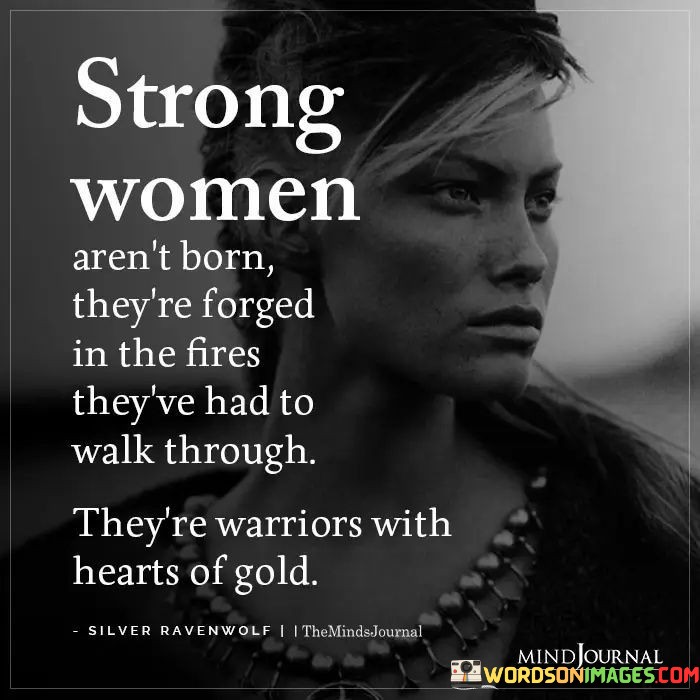 This empowering quote highlights the indomitable strength and resilience of women, emphasizing that strength is not something inherent but rather cultivated through life's challenges and trials. The metaphorical imagery of being forged in fires alludes to the hardships and adversities that women face, symbolizing the transformative power of these experiences. It suggests that the difficult journeys they navigate shape them into the strong and courageous individuals they become. Despite the obstacles they encounter, these women emerge as warriors with hearts of gold, exemplifying both fierce determination and boundless compassion. The phrase "warriors with hearts of gold" beautifully captures the balance between strength and empathy that defines these remarkable individuals. It reinforces the notion that their toughness doesn't make them callous, but rather, it enriches their capacity for love and understanding.In essence, this quote celebrates the resilience of women and the way they confront and overcome life's challenges with unwavering determination and grace. It acknowledges that their strength is not a result of luck or inherent traits, but rather a product of their experiences, hardships, and triumphs. By walking through the fires of adversity, they are refined, strengthened, and equipped to face whatever comes their way. Yet, beneath their warrior exterior lies a heart of gold, filled with compassion, empathy, and love for others. This combination of strength and compassion is what sets strong women apart, making them extraordinary and inspiring figures. This quote serves as a reminder of the unyielding spirit and incredible potential that lies within every woman, encouraging them to embrace their inner strength, face challenges head-on, and let their hearts shine with compassion and kindness.
