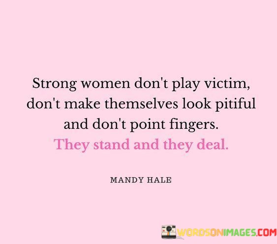 This empowering quote emphasizes the strength and resilience of women, encouraging them not to adopt a victim mentality or seek pity from others when faced with challenges. Instead, it urges women to face their adversities head-on and take control of their situations. By refusing to play the victim, strong women acknowledge their power to overcome obstacles and difficulties, displaying remarkable determination and fortitude.Furthermore, the quote emphasizes the importance of accountability and self-reliance. Strong women do not blame others or external circumstances for their problems; instead, they take responsibility for their actions and decisions, recognizing that they have the ability to shape their destinies. This attitude empowers women to confront and address their issues directly, finding solutions and moving forward with resilience.In essence, the quote celebrates the courage and independence of strong women who stand tall in the face of adversity, facing their challenges with unwavering strength and determination. It urges women to embrace their inner power and take charge of their lives, inspiring others to do the same. Through this message, the quote encourages a mindset of self-empowerment, personal responsibility, and the belief that every woman has the strength to triumph over life's difficulties.
