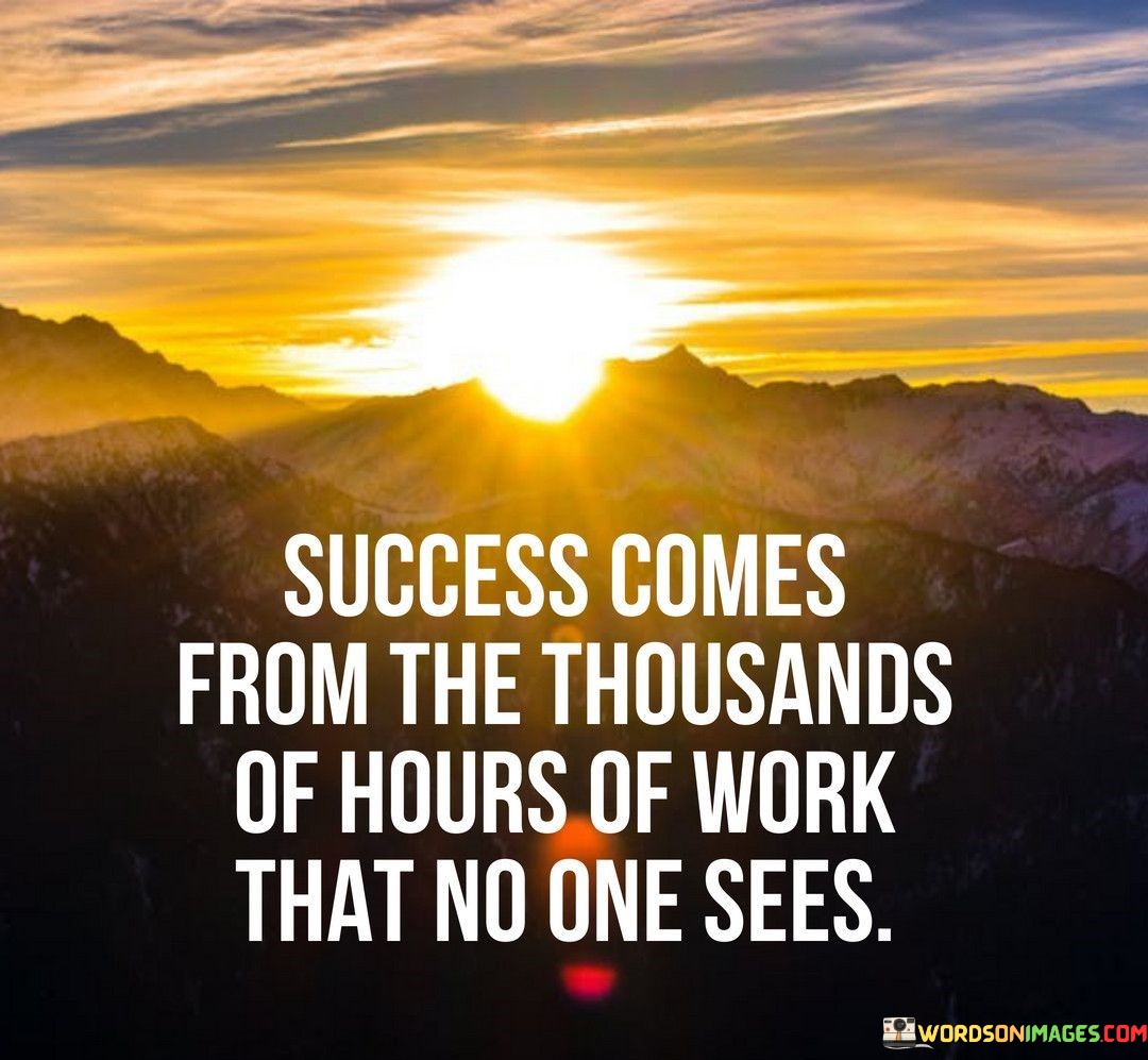 The quote implies that success isn't instantaneous; it's the outcome of sustained, often behind-the-scenes, work. It conveys the idea that while the end result might appear impressive, it's the hours of dedicated effort in the background that truly shape that success.