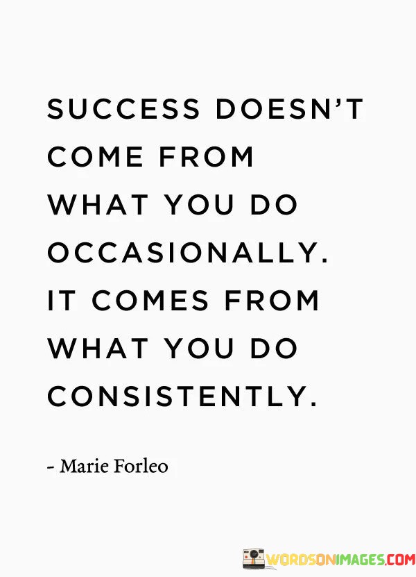 The quote challenges the idea of occasional actions leading to success. It implies that success is a result of persistent and disciplined behaviors. Consistency in actions, even if they are small, creates a cumulative effect that contributes to progress and achievement.