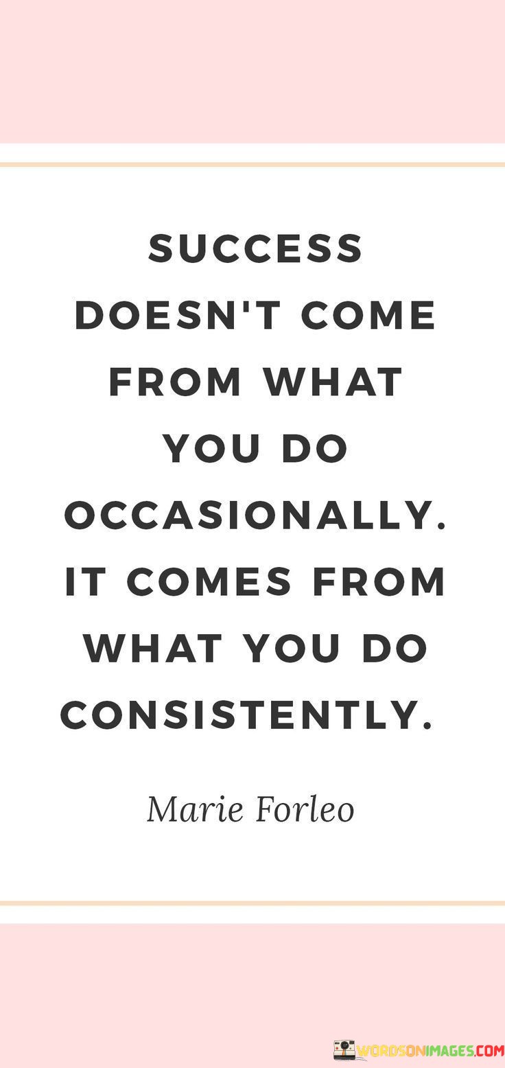 The quote "Success doesn't come from what you do occasionally, it comes from what you do consistently" underscores the significance of consistent effort and dedication in achieving success. It highlights the idea that sporadic or occasional actions are unlikely to yield significant outcomes, whereas a pattern of consistent actions over time can lead to meaningful achievements.