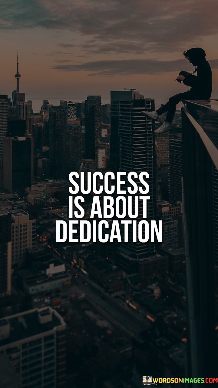"Success is about dedication." This phrase encapsulates the idea that achieving meaningful goals requires unwavering commitment and focused effort. It suggests that the path to success is paved by consistently dedicating oneself to the pursuit of one's objectives.