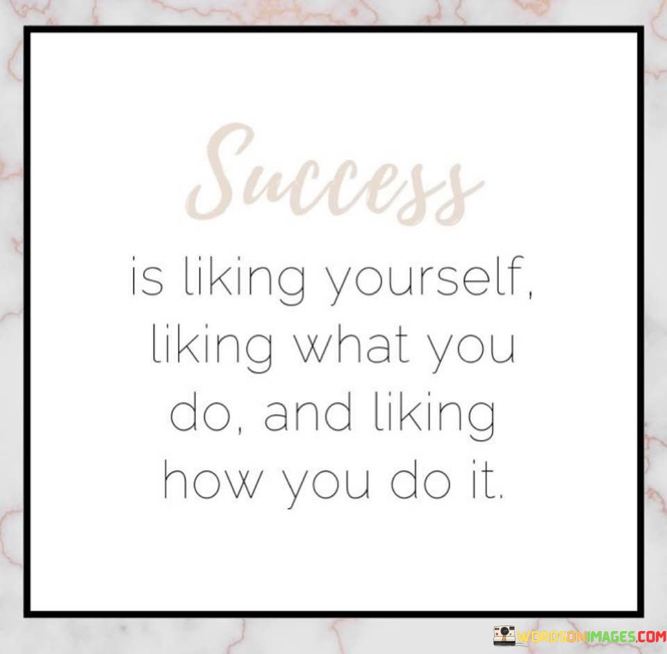 In summary, this statement defines success as a combination of self-acceptance, passion for one's work, and a sense of enjoyment in the process of achieving goals. It encourages individuals to seek success not only in the external world but also within themselves, emphasizing the importance of personal contentment and fulfillment as key components of success.
