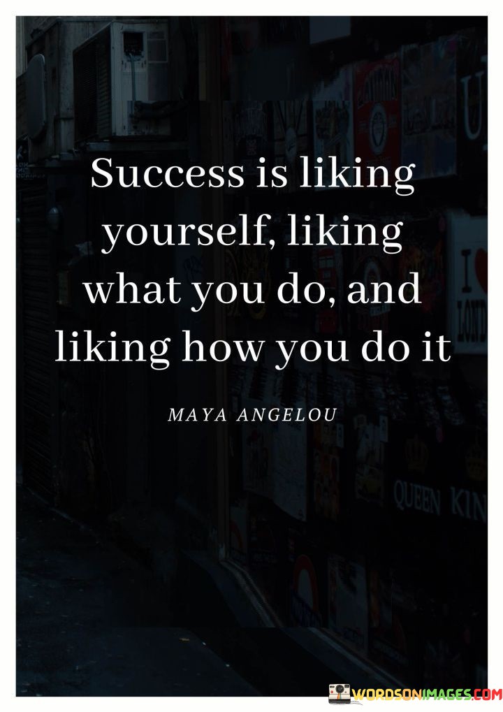 This statement offers a holistic perspective on success, emphasizing that it's not just about external achievements but also about personal fulfillment and self-satisfaction. In the first part, it suggests that success involves having a positive self-image and genuinely liking who you are as a person.