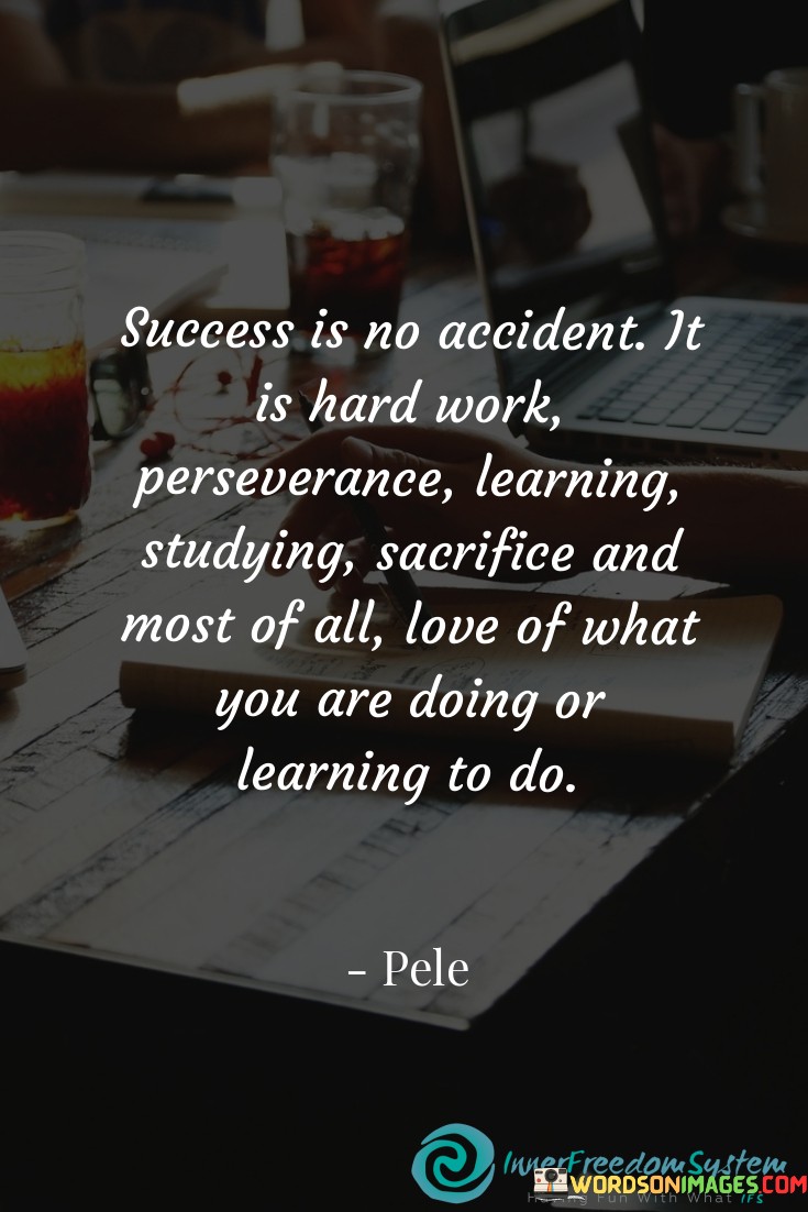 It underscores the multi-faceted nature of success. The phrase suggests that success is not a random occurrence but the result of deliberate actions, including hard work, perseverance, continuous learning, studying, making sacrifices, and a genuine passion for one's pursuits.