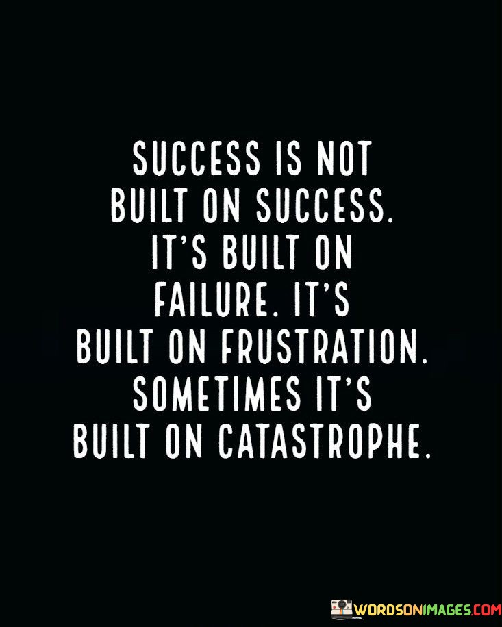 The statement "Success Is Not Built On Success; It's Built on Catastrophe" suggests that success often emerges from overcoming challenges and setbacks, rather than from a string of continuous successes.