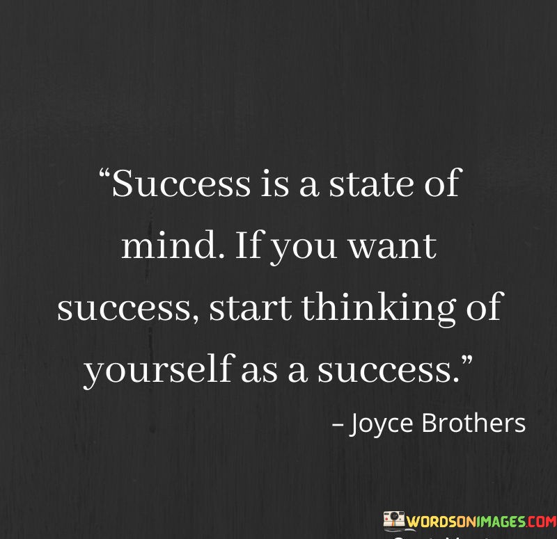 The quote asserts that success is a mindset and suggests that viewing oneself as successful is a crucial step towards achieving success. It implies that one's thoughts and self-perception play a significant role in shaping outcomes. In the first paragraph, the quote introduces the concept of success as a state of mind.