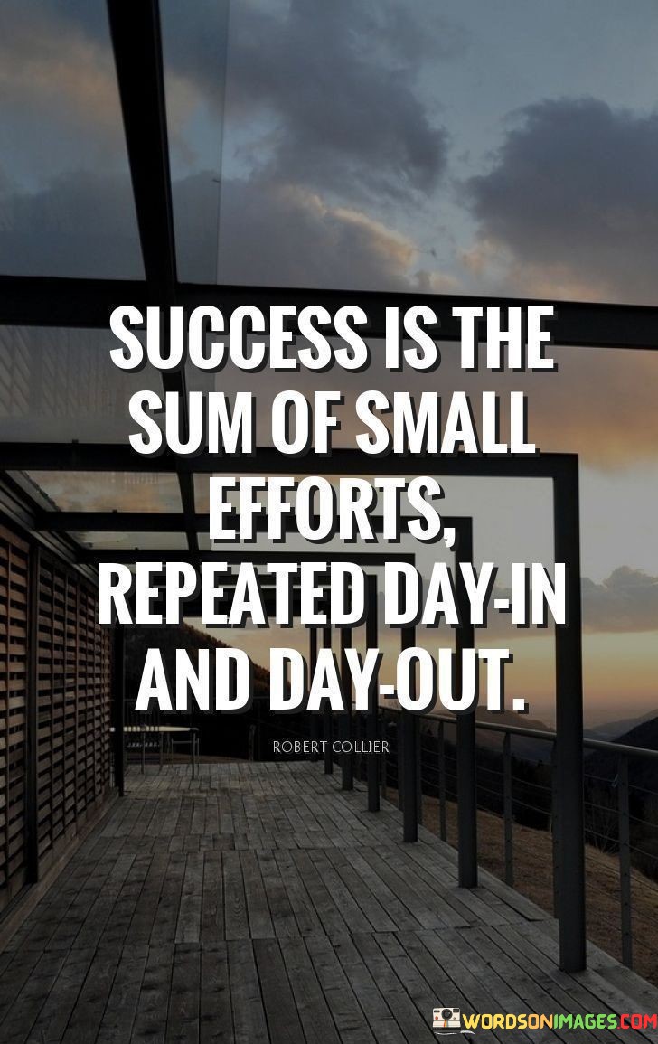 The phrase "Success Is the Sum of Small Efforts Repeated Day in and Day Out" succinctly emphasizes that consistent, daily actions, even if they appear minor, accumulate over time to lead to meaningful achievements.